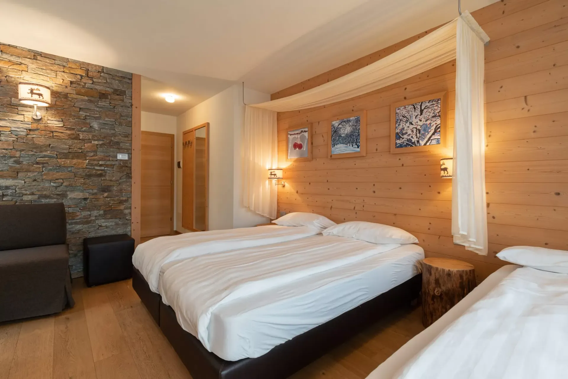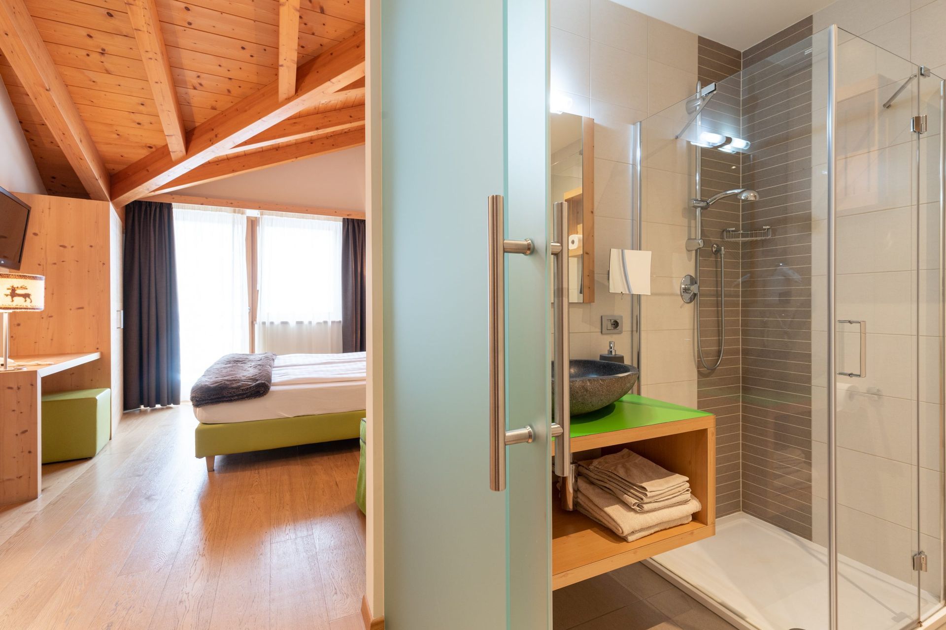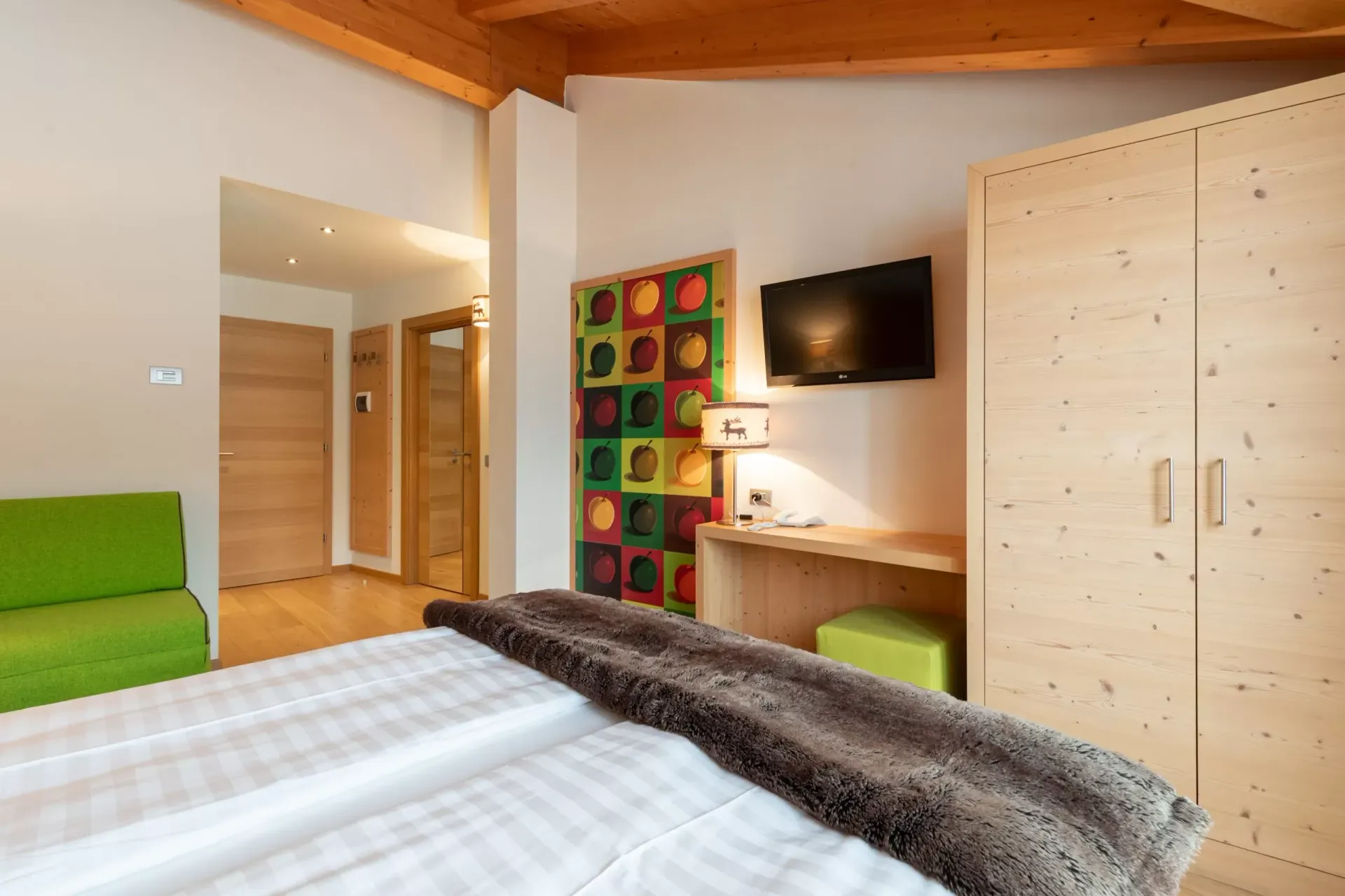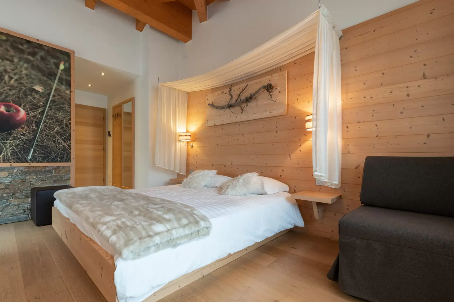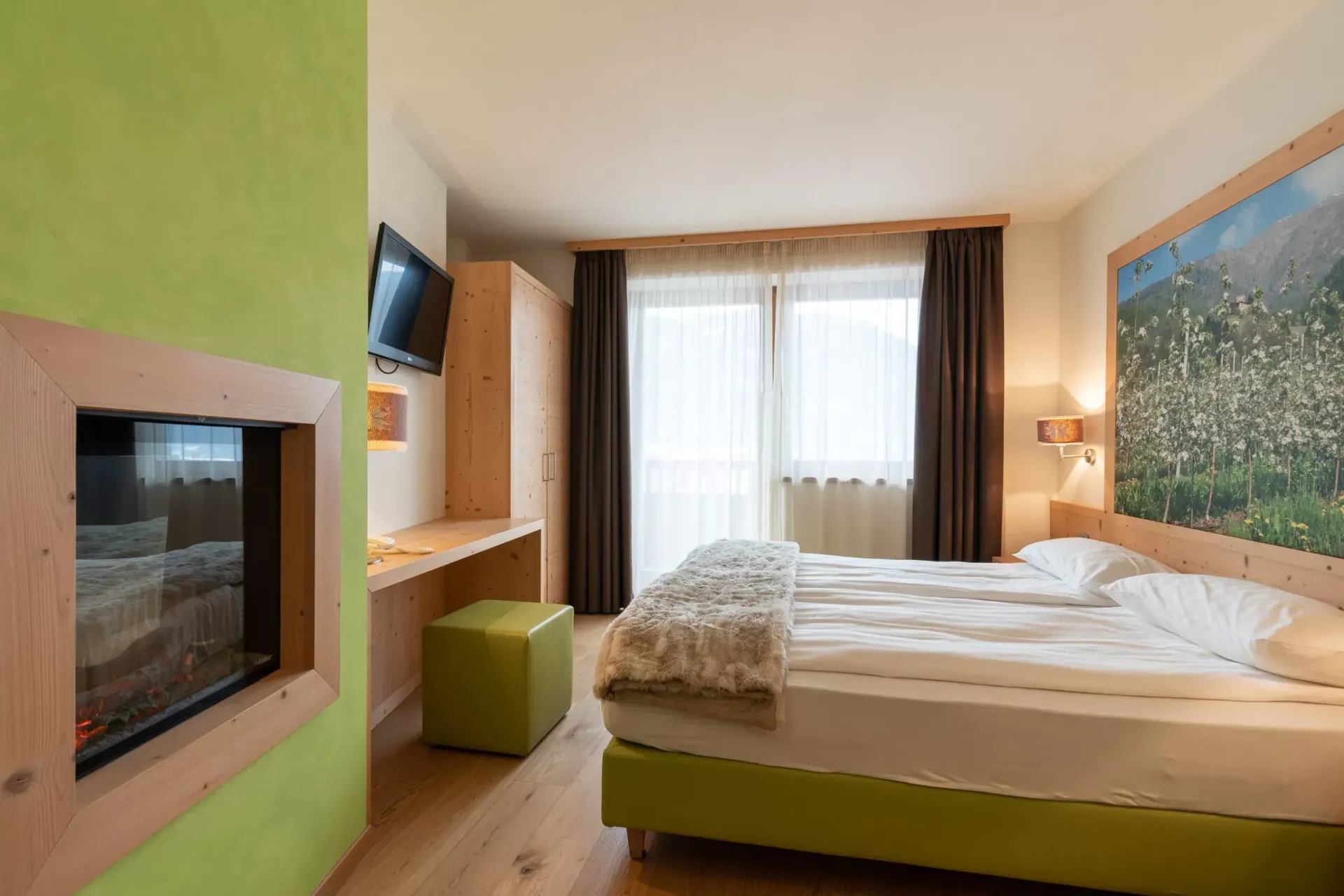 The hotel is themed around apples, reflecting the region's agricultural heritage, and offers a selection of activities centred on local traditions and wellness. Rooms are warmly decorated, often featuring wood accents, neutral tones, and views of the surrounding orchards or mountains. Amenities include a wellness area with a sauna and steam bath, designed to offer a peaceful escape, along with a relaxation room where guests can unwind with herbal teas and local delicacies.