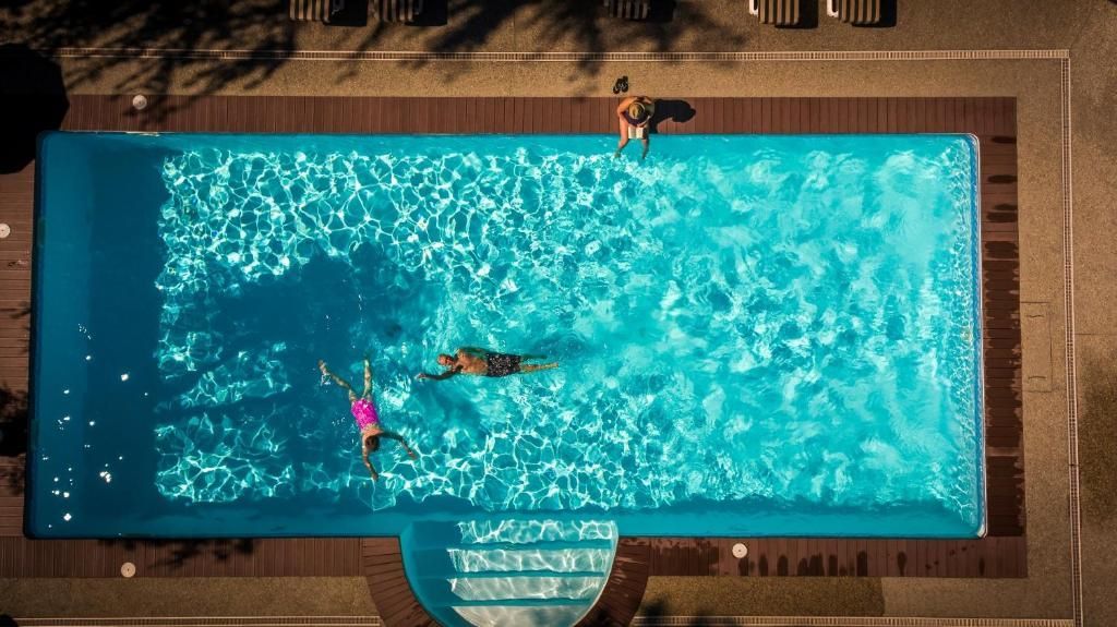 The hotel features 37 bright and spacious rooms, each designed to provide comfort and relaxation. Many rooms offer balconies with mountain or pool views, and some are equipped with cozy seating areas. Amenities include flat-screen TVs, free Wi-Fi, and private bathrooms with showers, hairdryers, and slippers.