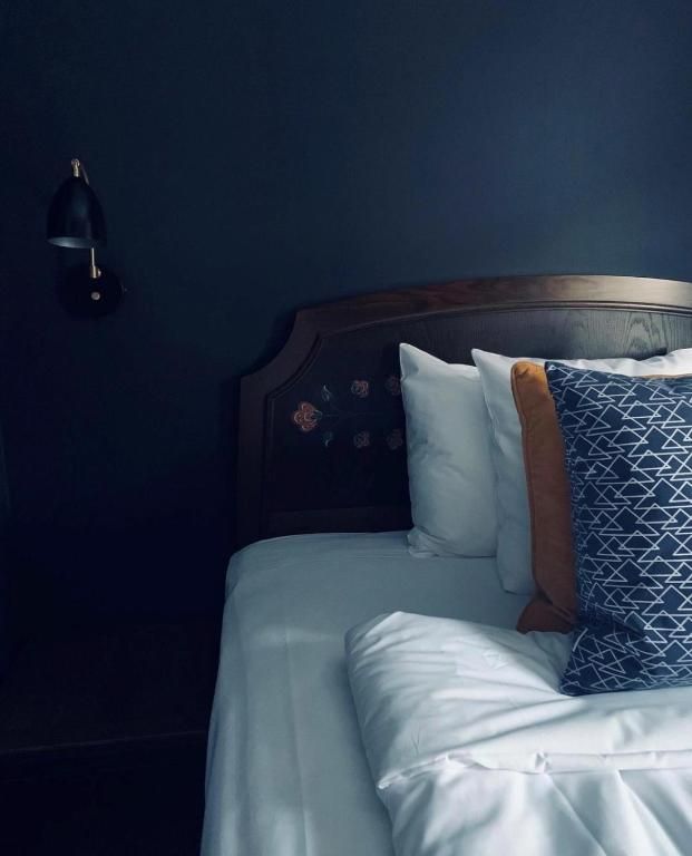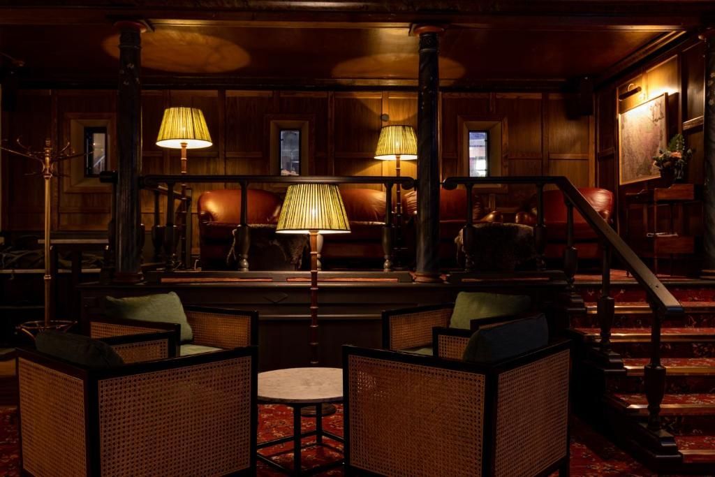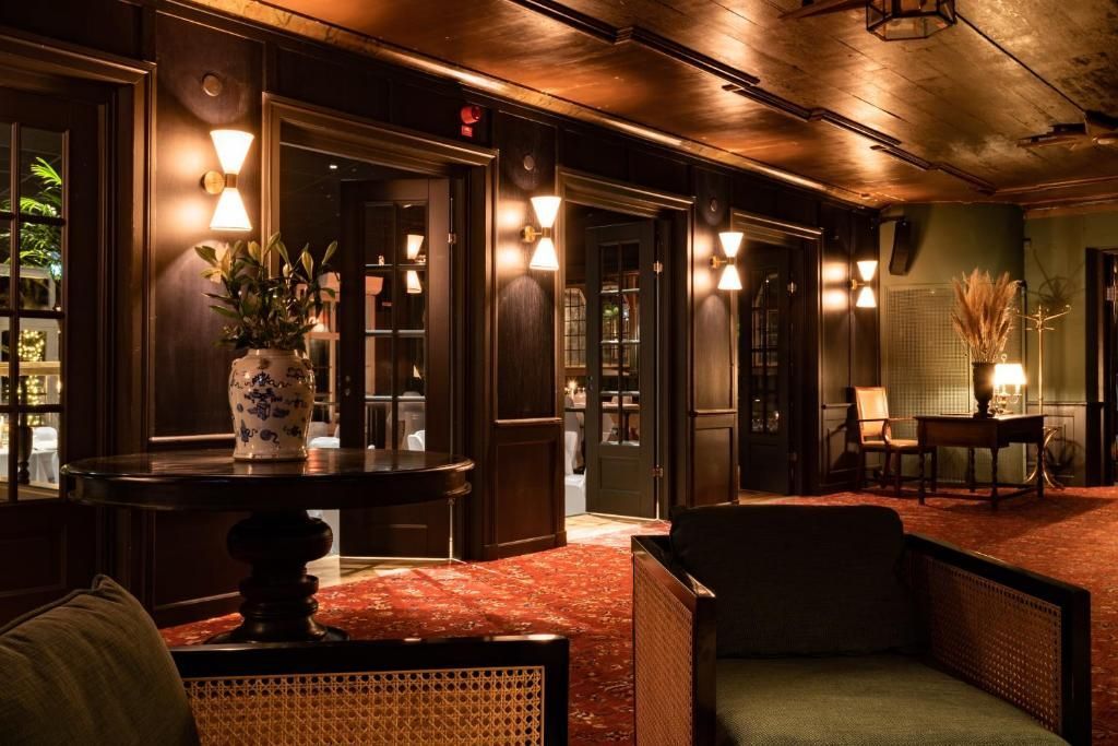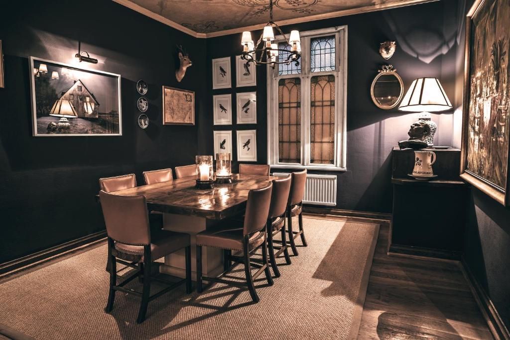 The hotel features 54 rooms, including one suite and two hotel apartments, all designed with a focus on comfort and stylish decor, featuring large sash windows and elegant dark hues.