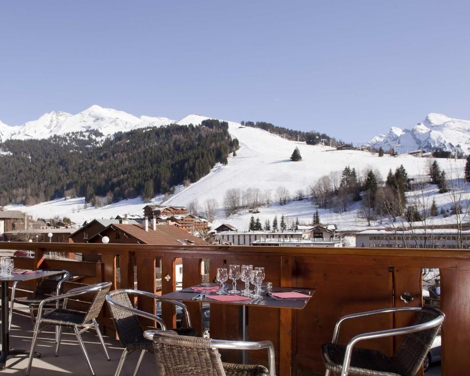 The hotel's rooms are decorated with exposed stone and wood, giving them a cozy, rustic feel. Each room comes equipped with a flat-screen TV, free WiFi, and a private bathroom, with some offering stunning views of the surrounding Aravis mountains​